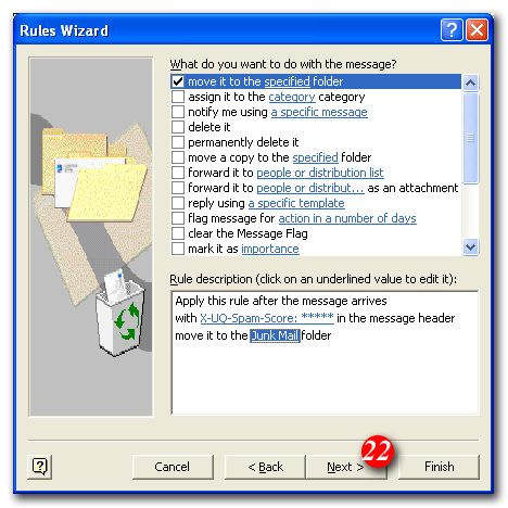 For example, if you wanted to consider anything with a score of 3 or more to be spam, the rule would look like: 'X-SpamDetect: ***'. Decreasing the number of asterisks will result in classifying more e-mails as spam. You may need to check your spam folder more carefully for non-spam e-mails that might have been classified as spam. If you wanted to rate anything with a score of 8 or greater as spam, the rule would look like: 'X-SpamDetect: ********'. Increasing the number of asterisks may result in fewer filtered e-mails being classified as spam and more potential spam staying in your Inbox.