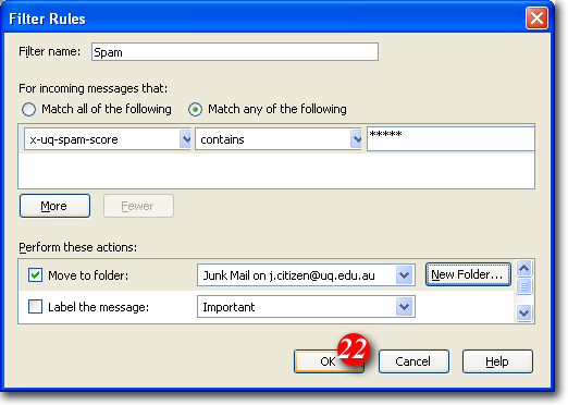 For example, if you wanted to consider anything with a score of 3 or more to be spam, the rule would look like: 'X-SpamDetect: ***'. Decreasing the number of asterisks will result in classifying more e-mails as spam. You may need to check your spam folder more carefully for non-spam e-mails that might have been classified as spam. If you wanted to rate anything with a score of 8 or greater as spam, the rule would look like: 'X-SpamDetect: ********'. Increasing the number of asterisks may result in fewer filtered e-mails being classified as spam and more potential spam staying in your Inbox.